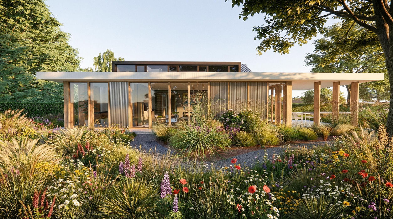 Binnen de strakke kaders van de gevel vormen contrasterende metalen invullingen een dynamisch element. Verticale metalen panelen benadrukken de heldere verticale lijnen van de architectuur. De combinatie van hout en metaal creëert een samenspel tussen warmte en robuustheid, waardoor de woning een eigentijdse en tijdloze uitstraling krijgt.