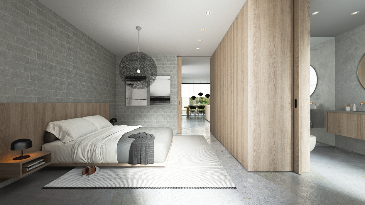 De oriëntatie van de woning wordt nauwgezet overwogen om optimale natuurlijke zonwering en energie-efficiëntie te waarborgen. Het terugduwen van het volume op bepaalde plaatsen creëert niet alleen prachtige terrassen, maar ook een comfortabele en evenwichtige leefruimte.