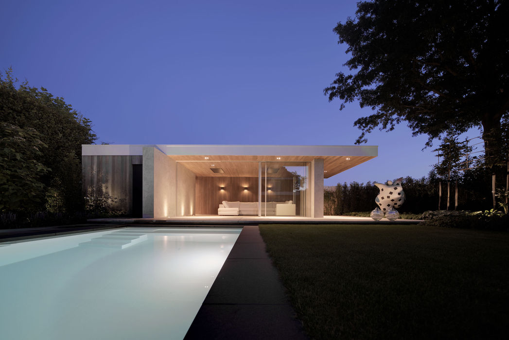 Het poolhouse wordt gekenmerkt door zijn minimalistische uitstraling. Door zorgvuldige engineering en detaillering zijn alle kozijnen volledig geïntegreerd in zowel het plafond, de vloer als de wanden, waardoor de grens tussen binnen en buiten bijna volledig vervaagt. Schaduw in de binnenruimte wordt geboden door de ruime overstekken, die zijn afgewerkt met een houten plafond.